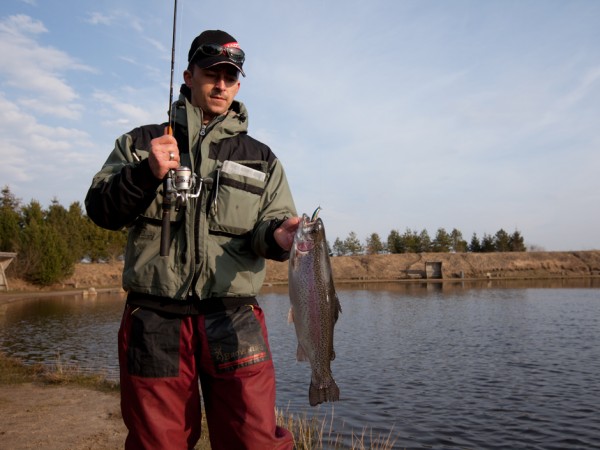 Tommy Klobucar freut sich über eine weitere stramme Regenbogenforelle. Der Fisch biss auf einen Pixel Minnow von Hart kurz bevor er den Wobbler aus dem Wasser heben wollte.
