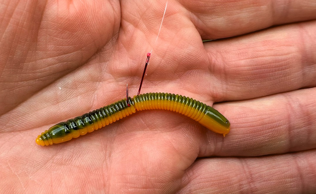 Dieser Larvy aus TPE-Material wurde L-förmig angeködert damit er sich im Wasser dreht.