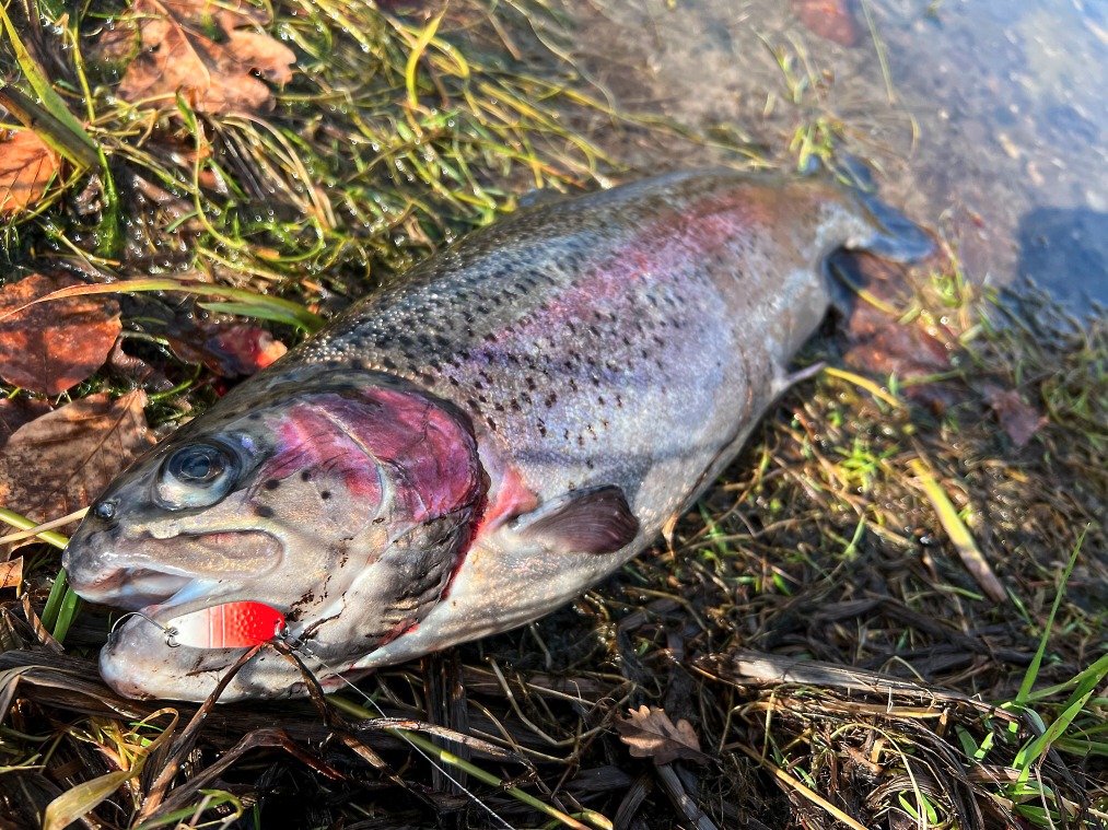 Großer „Lachs“ auf kleinen Spoon. Im Winter fängt man oft nicht die Massen an Fisch, dafür aber sehr schöne Forellen.