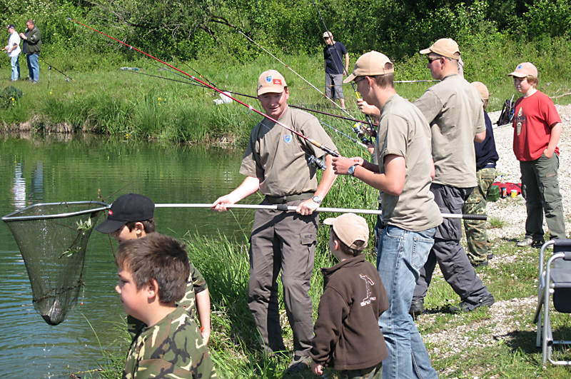 Die ersten Forellen ließen nicht lange auf sich warten. Anschließend wurden sie ausgenommen. Der Zeltlagerkoch ließ es sich nicht nehmen, diese gleich am nächsten Tag zuzubereiten. Die Jugendlichen angelten aber nicht nur auf Forellen, sie fingen auch einige Karpfen, Döbel, Barsche und Aale. Nach dem Frühstück gingen sie mit zwei Betreuern an Bord zum Schleppfischen an den Sportsee. Somit bekamen auch die Jungangler einen Einblick in das Hechtfischen mit der Spinn- und Schlepprute. Damit die weniger erfolgreichen Angler auch eine Chance auf einen guten Platz hatten, veranstalteten die Organisatoren auch zwei Runden Casting und ein Kickertunier. Für einige Kids ging es sogar noch zum Jiggen auf Zander. Im Verlauf des Zeltlagers lernten die Teilnehmer auch jede Menge über das moderne Karpfenangeln. Sie bauten Rigs und rollten Boilies. Da es beim Angeln nicht nur ums Fische fangen geht, sondern auch Naturschutz betrieben wird, war es für die Petrijünger selbstverständlich, dass sie die beiden Mooser-Weiher nach dem Angeln vom herumliegenden Müll befreiten. Dabei fieberten einige Jungangler bereits der abschließenden Siegerehrung entgegen. In der Kombination Fischgewicht, Casting und Kickern lag Felix Buschmann vorn, gefolgt von Jason Reisch und Stefan Schmitt. Dank des Einsatzes zahlreicher Sponsoren war es den Organisatoren möglich, jedem Teilnehmer einen Preis überreichen zu können. Zusätzlich gab es eine Urkunde mit Bild vom gefangenen Fisch und einen Pokal. Die Teilnehmer reisten ab traurig darüber, dass ihr Jugendangelcamp wieder vorbei ist, doch auch freuend auf das Bett zu Hause und den Fernseher. Viele meldeten sich gleich für das Jugendzeltlager 2010 wieder an.