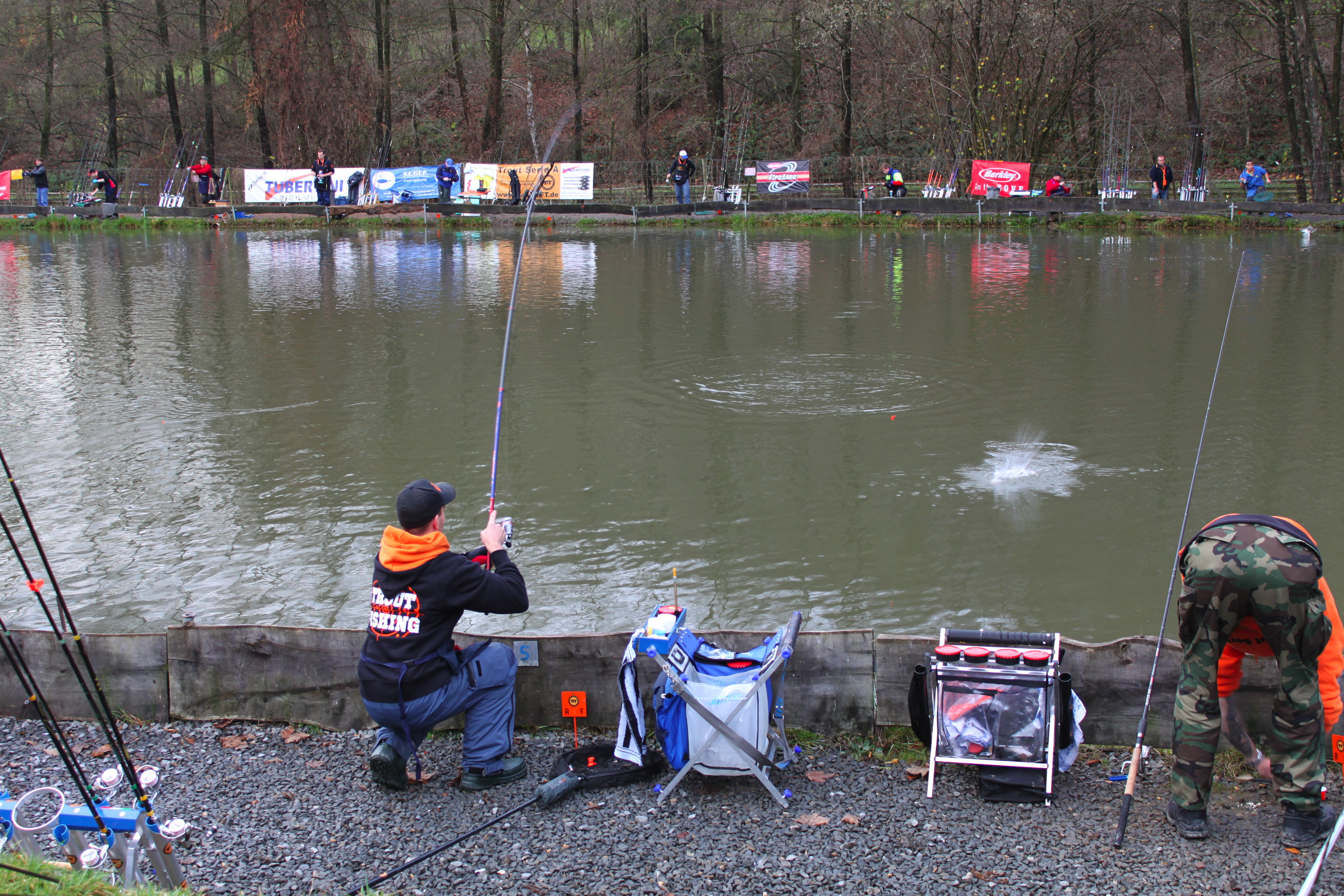 Das Abschlussfischen mit Freunden der TFT Trout Serie A an der Forellenanlage in Millerscheid ließ die Herzen aller Forellenseeangler höher schlagen. DJ CD sorgte den ganzen Tag an seinen Mischpulten für beste Stimmung, Bierpilz und Grillstation sorgten für Wohlbefinden bei den Zuschauern und Gästen. Um 9 Uhr startete das vierstündige Demo-Fischen, an dem auch der italienische Mehrfach-Weltmeister Gino Soffritti mit seinem Top-Team teilnahm. Außerdem waren die 32 erfolgreichsten Teilnehmer der Trout Serie A 2010 dabei, um ihr Können noch einmal unter Beweis zu stellen. Geangelt wurde jeweils im Stundenrhythmus, wobei nach jeder Stunde der Platz gewechselt wurde. Die Forellen waren an diesem Tag besonders beißfreudig, jeder Teilnahmer konnte sich nach dem Angeln über eine volle Kühltasche fangfrischer Forellen freuen. 37 Angler brachten es fertig, in den vier Stunden 1875 Forellen zu fangen.
