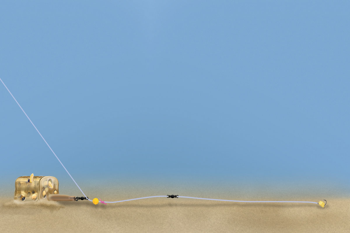 Um die Bisse besser erkennen zu können, montiere ich das Futterkörbchen frei beweglich auf der Hauptschnur. Bei einem Biss bleibt das Futterkörbchen am Grund liegen und der Biss wird nahezu direkt an die Rutenspitze übertragen. So spürt der Fisch kaum Widerstand.