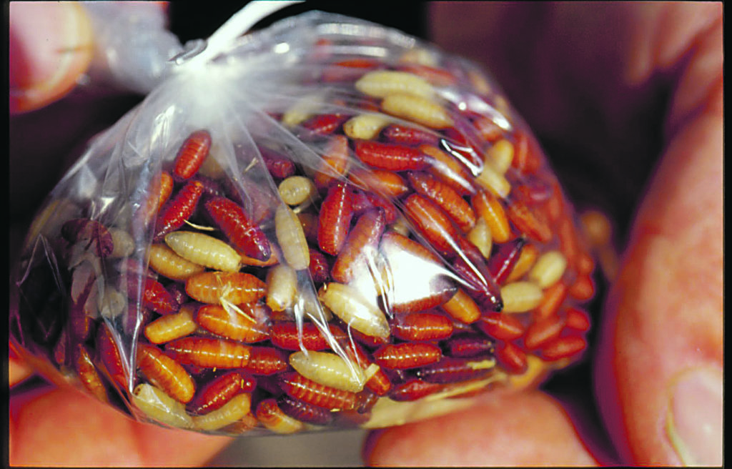 Als nächstes rührt man einen halben Liter Sägemehl (reines Holz!) mit 150 ml Wasser an und mischt darunter die anderthalb Liter Maden. Das verhindert, dass die Maden austrocknen. Übrigens sollte man auch Maden, mit denen man angeln will, nicht zu trocken hältern. Ganz leicht angefeuchtetes Sägemehl verhindert vorzeitigen Maden-Tod! Im feuchten Sägemehl man sie in einem Madenbeutel im Kühlschrank bei maximal 4° C aufbewahren. Nach 3 bis 4 Tagen werden die Maden erneut gesiebt, und die ersten Caster können abgesammelt werden. Weitere „Schluffen“ entfernt man gleich mit.