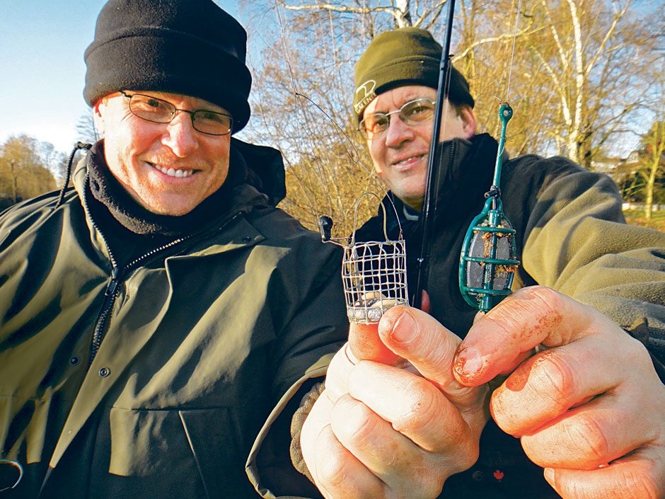 …Doch beim Auspacken stellten wir fest, dass die Strömung durch die vorherigen Regentage deutlich stärker war als erwartet. Unter solchen Umständen mit einem Waggler auf 30 Meter Distanz zu angeln und ständig mit dem Schnurbogen kämpfen zu müssen, erschien uns nicht optimal. Im Sommer mag das kein Problem sein, aber wenn die Fische im Winter nur ganz vorsichtig beißen, sollte sich der Köder bzw. die Pose nicht zu schnell bewegen. Also haben wir kurzfristig umgeplant und einfach zwei verschiedenen Futterkorb-Montagen getestet. André Pawlitzki hat dann einfach mit kurzem Vorfach und festem Method-Feeder geangelt, Frank Schlichting hat es direkt daneben mit langem Vorfach und frei laufendem Futterkorb versucht.
