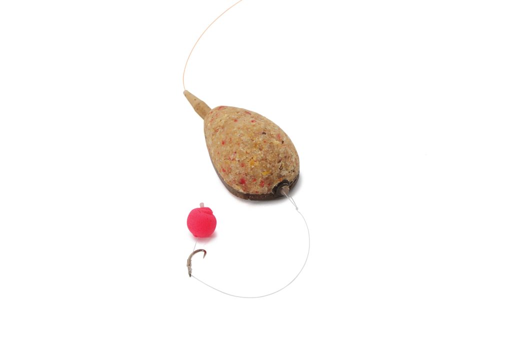 So sieht die fertige Method Feeder-Montage aus. Korb, Vorfach, Haken mit zum Beispiel Mini-Boilie. Der Fisch hakt sich selbst und zieht die Spitze der Feederrute krumm.