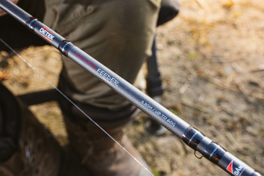 Beim Method Feedern in kleineren Gewässern muss die Rute nicht lang sein. Modelle in Längen von 3,0 oder 3,30 Metern reichen aus. Das Wurfgewicht pendelt sich zwischen 60 und 110 Gramm ein – klingt viel, aber ein gefüllter Method-Korb wiegt einiges. Manche Hersteller verkaufen auch spezielle Method Feeder-Ruten. André benutzt in diesem Fall die neue DAM DETEK Method Feeder.