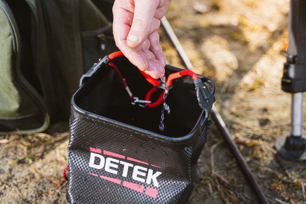 Ein kleiner Tipp: Sie haben den ganzen Tag mit flüssigen Attraktoren, Pulverfutter und im Optimalfalle auch Fischschleim zu tun. Diese Kombi versaut das schicke neue Gerät super schnell – ein klein wenig Wasser neben dem Angelstuhl sorgt für saubere Finger und dadurch auch sauberes Gerät.