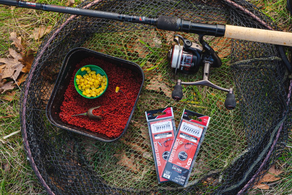Was genau Sie fischen, hängt natürlich von Ihrer Vorliebe ab. Wir empfehlen Micropellets oder Groundbait als Lockfutter, den Haken können Sie zum Beispiel mit Mais, Maden, Würmern oder Mini-Boilies bestücken. Den Futter-Vorrat sollten Sie erhöht nebem Ihrem Stuhl platzieren, sodass Sie auch im Sitzen Zugriff darauf haben. Das macht die ganze Angelei angenehmer und schneller.