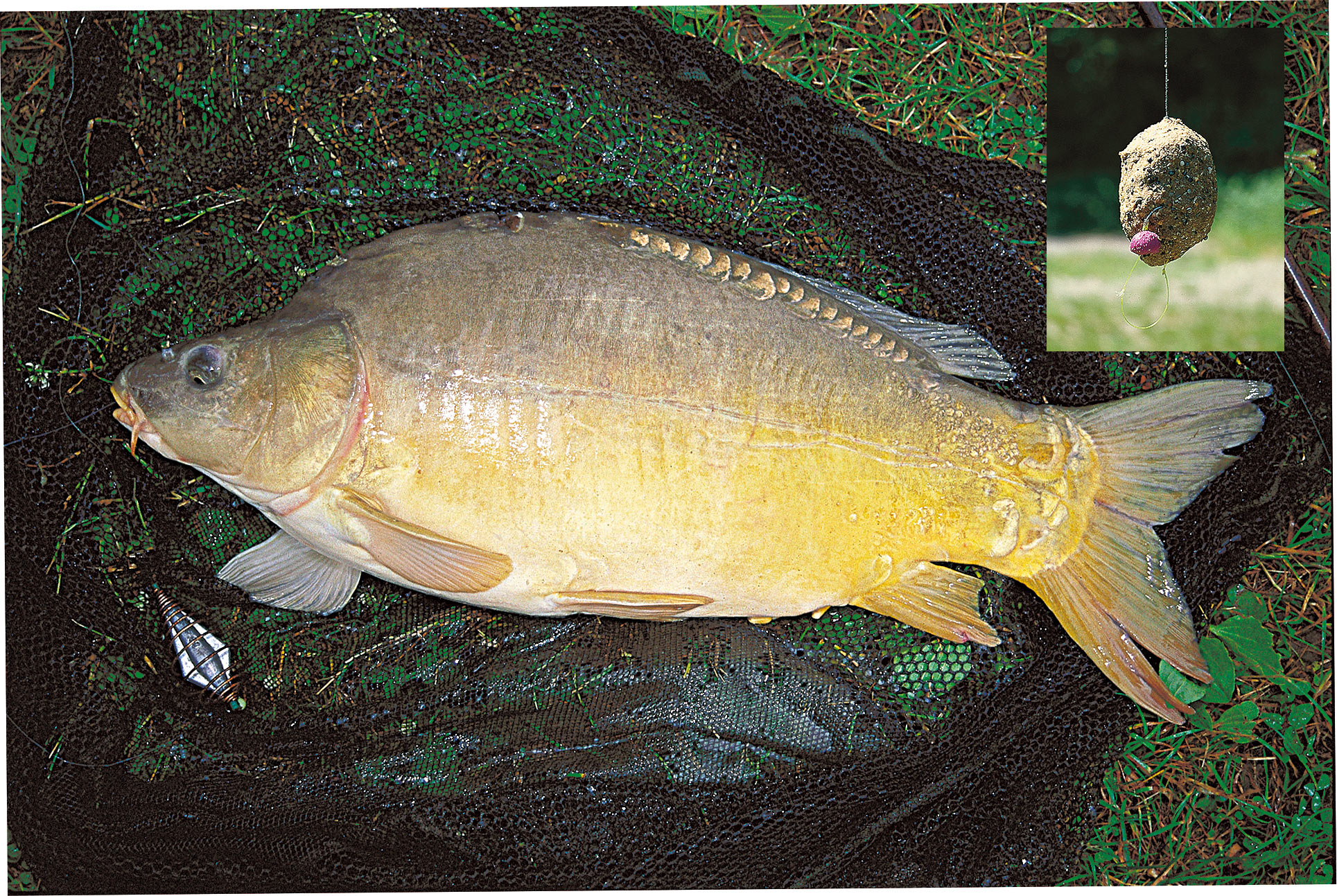 The Method nennen die Engländer das Angeln auf Karpfen mit einer Futterspirale mit Innen-Schnurführung (oben, links am Bildrand). Sie wird mit Futter ummantelt, dann wird der Köder seitlich in den Futterklumpen gedrückt (kleines Foto). BLINKER