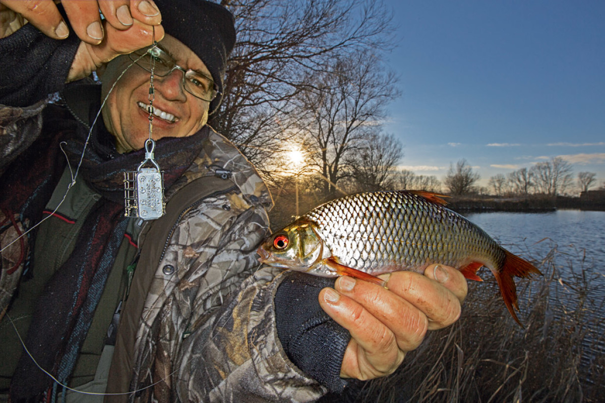Unsere Winter fallen ja in der Regel eher mild aus, was sich auf die Fressaktivität der Rotaugen auswirkt. So lange es also kalt ist, aber kein strenger, lang dauernder Frost herrscht, gehören Maden zu den gern angenommenen Ködern. Es macht gar nichts, dass die Krabbler im kalten Wasser kaum Reaktion zeigen, die Rotaugen nehmen sie dennoch. Bei Frost aber muss man mit der Ködergröße weiter runter gehen, weil die Rotaugen dann noch weniger fressen. Dann bieten sich Pinkies an. Dies auch aus dem Grund, weil man dann auch viel feiner angeln und z.B. mit der Hakengröße runter gehen muss. Und es ist nun einmal schwierig eine fette Fleischmade so auf einen feinen 18er oder 20er Haken zu ziehen, so dass noch die Hakenspitze heraus schaut. Ein weiterre Erfolgstrategie ist es, seine Maden mit Aromen auf zupeppen. Maggie, Gewürze oder auch Dips eignen sich hervorragend, um im Winter die Rotaugen anzulocken.