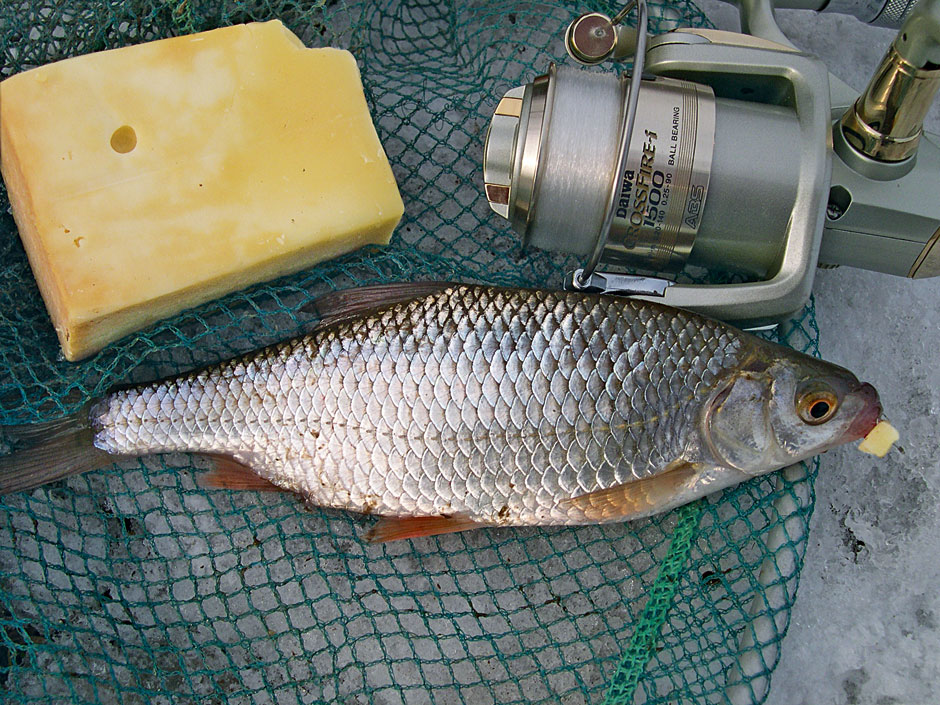 Käse als Köder für Rotaugen? Aber ja, warum nicht!? Käse ist nicht nur ein toller Köder, den man mit entsprechenden Brotausstechern (Bread Punches) in beliebiger Winzigkeit anbieten kann, er ist sogar oft der Bringer für ganz besonders große Rotaugen. Zu den im Winter fängigen Sorten gehören Gouda (ab Reifungsgrad mittelalt) Tilsiter oder Stinker wie der Limburger.