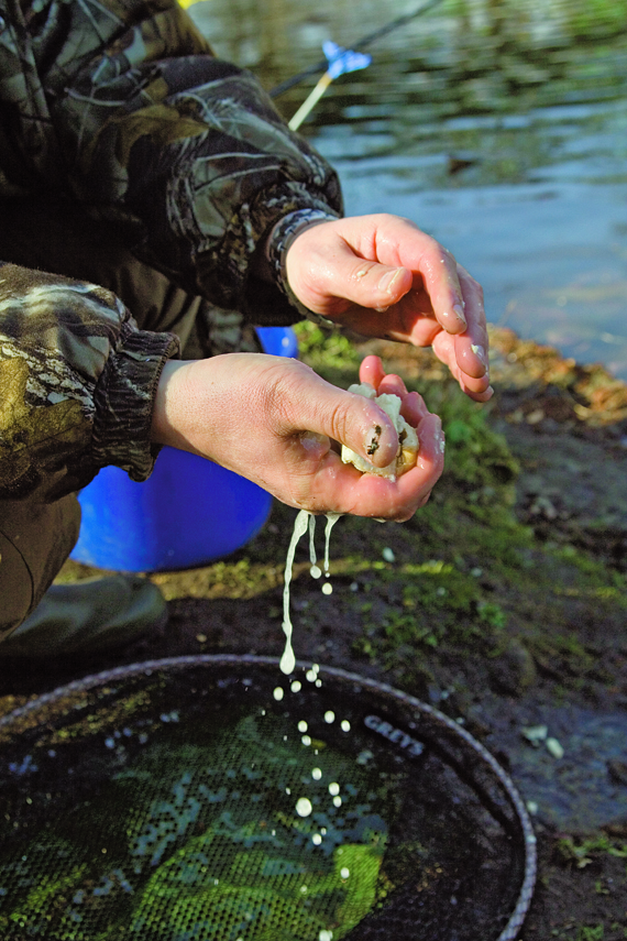 Zuerst werden die Weißbrotscheiben mit Hilfe des Keschers eingeweicht.Dann drückt man mit den Händen das Wasser aus den Scheiben heraus.Die feuchten Flocken kommen zusammen mit ein paar Maden in einen Eimer. Für eine bessere Bindung fügt man noch etwas Stippfutter hinzu. Das Ganze gut durchkneten. Danach ist die Brotmischung fertig.