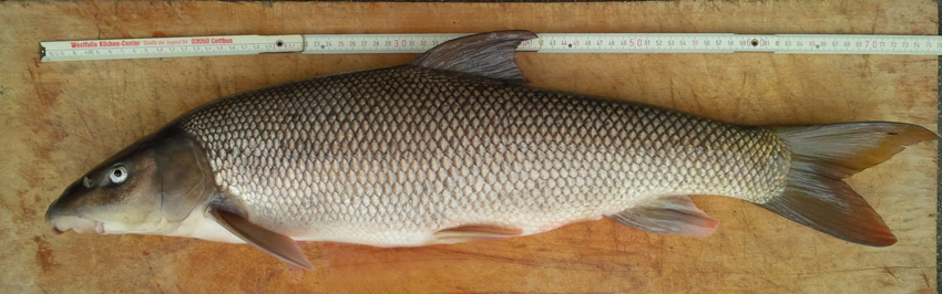 Nach rund 10 Minuten Drill, bei denen der Fisch immer wieder in die Strömung flüchtete, konnte Tom dann eine kapitale Barbe keschern. Der 76 Zentimeter lange Bartelbrummer wog genau 7 Pfund 350 Gramm.