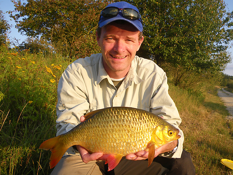 In satten Farben glänzen das goldene Schuppenkleid und die markanten, roten Flossen im Sonnenlicht. Passend dazu strahlt Martin Langner mit der Sonne um die Wette. Der Angler aus Neumarkt in der Oberpfalz hat am 6. September einen traumhaften Weißfisch gefangen. Die 40 Zentimeter lange und 950 Gramm schwere Rotfeder ließ sich im Rhein-Main-Donau-Kanal von Maden zum Anbiss verführen. Martin Langner hatte den Köder an einem 16er Haken angeboten und hatte im Drill keine Mühe, den kapitalen Fisch an der 16er Hauptschnur auf seiner Shimano-Kombination aus Antares-Rute und Stradic-Rolle über den Kescher zu führen. Der Fischereiverein Pyrbaum bestätigte auch offiziell den Fang der prächtigen Rotfeder.