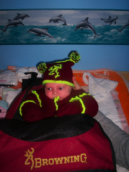 Browning-Teamangler halten die Markentreue bekanntlich hoch. Torsten und Stefanie Waller vom Browning-Team Sachsen konnten sich Anfang Februar über die Geburt ihrer Tochter Mariella Jasmin freuen. Der mögliche Stippernachwuchs in spe wurde gleich standesgemäß eingekleidet. Das Browning selbst keine Bekleidung in Babygrößen im Programm hat, mussten die Strickkünste der Großmutter herhalten.