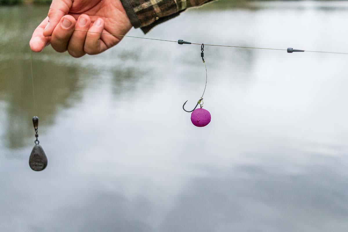 Das Chod-Rig (hier ein „Naked Chod“) besitzt einen steifen Seitearm, der sich nie mit der Hauptschnur verwickelt. Das Rig wird mit Pop-Ups bestückt.