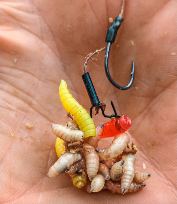Auch die Art, wie die Maden beim Karpfenangeln auf den Maden-Clip gezogen werden, spielt eine nicht zu unterschätzende Rolle. Wenn die Larven mittig auf den Clip gestochen werden, laufen sie sofort aus und bewegen sich auch nicht mehr. Maden können an einem Hautlappen am dickeren Ende aber auch ganz vorsichtig so aufgezogen werden, so dass sie nicht aufplatzen und auch nicht auslaufen. So aufgezogen bleiben sie lebendig und bewegen sich am Haken. Und 20 oder 30 solcher quirligen Maden ergeben natürlich ein enorm attraktiven Köder.