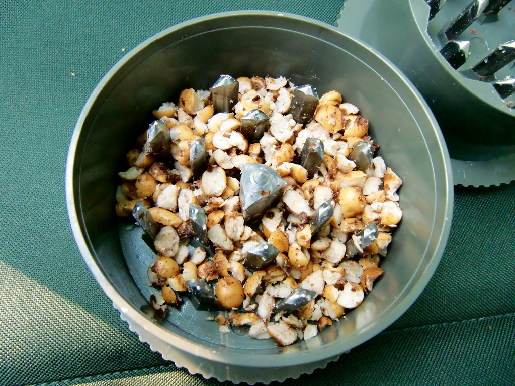 Die Tigernüsse werden wie ein Boilie aufs Haar gezogen. Zum Anfüttern sollte man zerstoßene Tigernüsse verwenden. Die Nussstückchen geben deutlich mehr Aromen ins Wasser ab als ganze Nüsse. Weil der Lockeffekt dadurch höher ist, werden die Karpfen schneller auf den Köder aufmerksam. Um Nussstückchen herzustellen, kann man die Tigernüsse mit Hilfe eines Messers zerteilen. Das ist aber viel zu aufwendig, besonders wenn man größere Mengen benötigt. Fürs Zerteilen der Nüsse kann ein sogenannter Bait Crusher verwendet werden. Damit lassen sich die Nüsse unkompliziert zerkleinern.