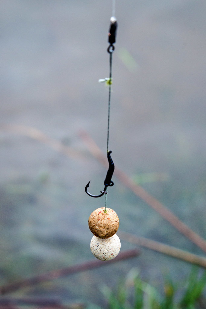 Gerade an Gewässern mit einem hohen Aufkommen an natürlicher Nahrung sind diese Boilies die richtige Wahl. Sie stechen häufig sogar das natürliche Nahrungsangebot aus. Dazu fällt mir eine Session am „Eisheiligen-Wochenende“ im Mai ein. Nach einigen warmen Tagen hatte in dem großen Natursee die Laichzeit angestanden, bis ein Kälteeinbruch den Fischen die Lust am Liebesspiel vermieste. Jetzt war es an der Zeit fürs „Frustfressen“. Unsere Wahl fiel auf eine Bucht, die in den letzten Wochen nicht so stark beangelt worden war. Gerade an großen, stark befischten Seen sollte man die verschiedenen Gewässerabschnitte immer gut im Auge behalten. Ist der Angeldruck ist einem Bereich anhaltend stark, verstecken sich die Karpfen in ruhigeren Gefilden. Als ich in die Bucht hineinruderte, überkam mich das Gefühl, eine „Big Fish Bay“ erwischt zu haben. Das Wasser war direkt vor dem Schilf noch drei Meter tief und die Bucht machte einen ziemlich verwilderten Eindruck.