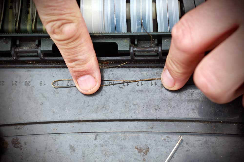 - Schritt: Ein Stück Camo Tex wird von der Spule abgetrennt. Es sollte lang genug für den Hakenköder sein und wird durch den Micro-Ring-Swivel gesteckt.