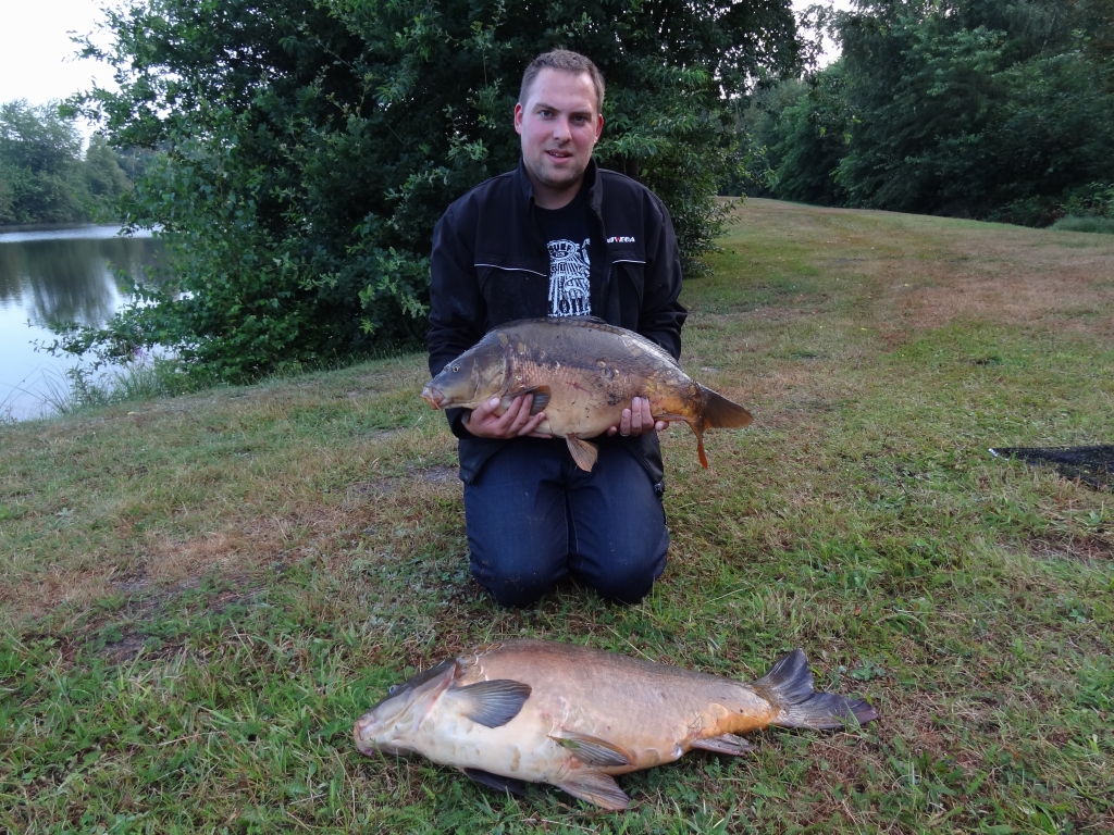 Am 30. Juli war ich an einem kleinen, ca. 1 Hektar großen Teich auf Karpfen aus. Um 5 Uhr morgens hatte ich meine vier Ruten mit kabellosen Bissanzeigern aufgebaut, gegen 6 Uhr erfolgte der erste Run auf einen 16er Boilie. Weil der Karpfen versuchte seitwärts in die Büsche zu ziehen, blieb mir nichts anderes übrig, als in den Teich zu waten. So stand ich brusttief mit Rute und Kescher im Wasser. Nach 15 spannenden Drillminuten hatte ich den Karpfen dann im Kescher. Kaum war ich dabei, Fotos von dem Fisch zu machen, piepte der Bissanzeiger. Der erste Haken hatte sich im Kescher verfangen, und so zückte ich kurzerhand das Messer, löste die Montage und lief mit dem Kescher zur Rute. Auch dieses Mal musste ich ins Wasser, weil noch mehr Büsche im Weg waren, in denen sich meine Schnur unweigerlich verfangen hätte. Auch den zweiten Karpfen konnte ich glücklich landen. Beide Fische hatten ein Gewicht von jeweils ca. 30 Pfund und bissen auf einzelne 16er Ananasboilies von Quantum, die ich am Haar angeboten hatte. Die Stellen wurden nicht mehrere Tage vorher angefüttert. Nur zum Beginn des Angelns hatte ich jeweils eine Handvoll Dosenmais um die Boilies verteilt.