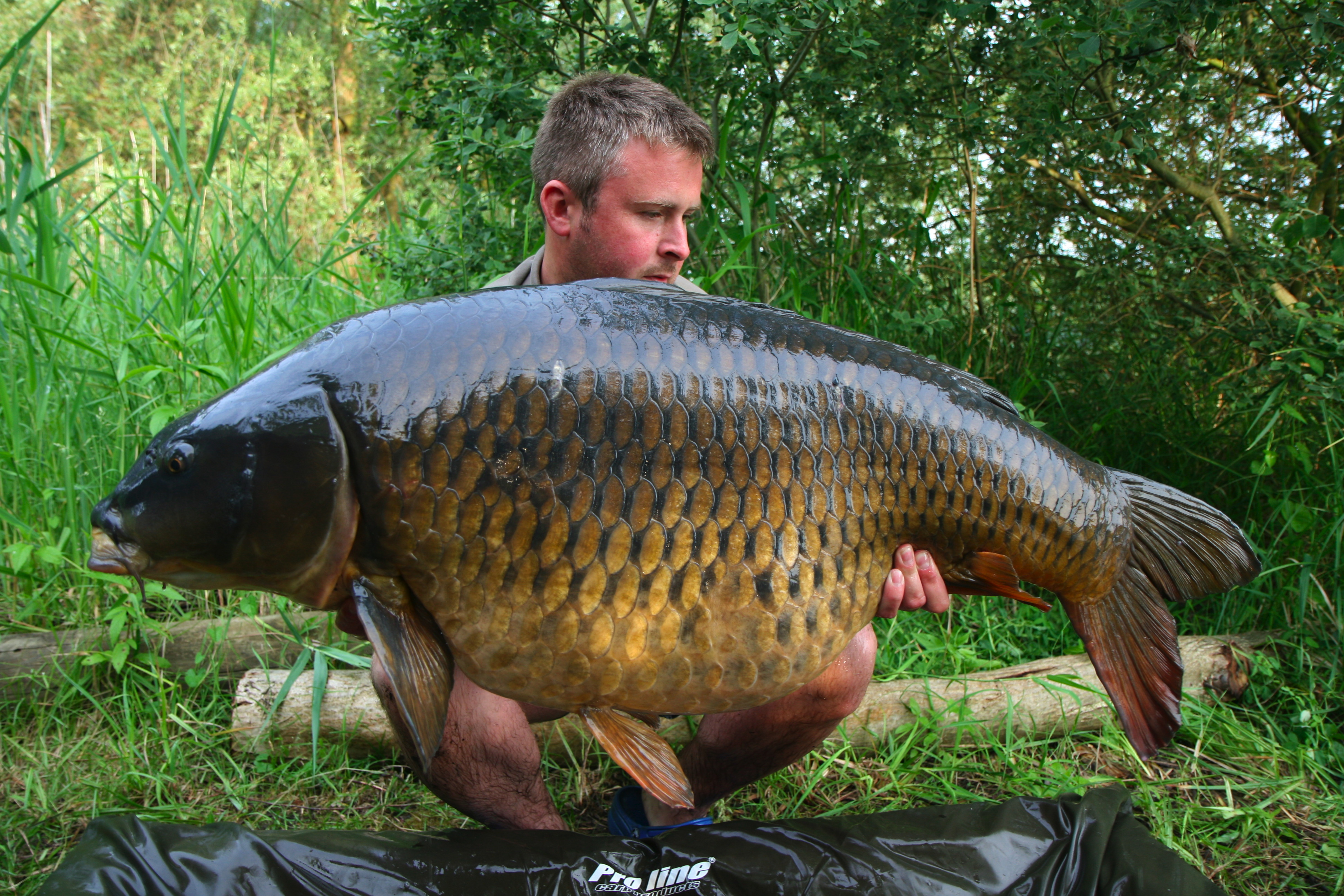 Der 12. Juli war ein besonderer Angeltag für Christian Finkelde. Am Baggersee entdeckte er einen Riesenkarpfen, der ihn zu einem Platzwechsel bewog. Am neuen Platz angekommen, wurde dieser mit einigen wenigen 20 Millimeter großen CF1 Squid & Liver Boilies, T-Pellets und CF1 Grundfutter bestückt. Am Abend gegen 20.30 Uhr kam der Biss. Nach spannendem Drill konnte Christian einen gigantischen Schuppenkarpfen keschern. Die Waage zeigte 71 Pfund 200 Gramm an.
