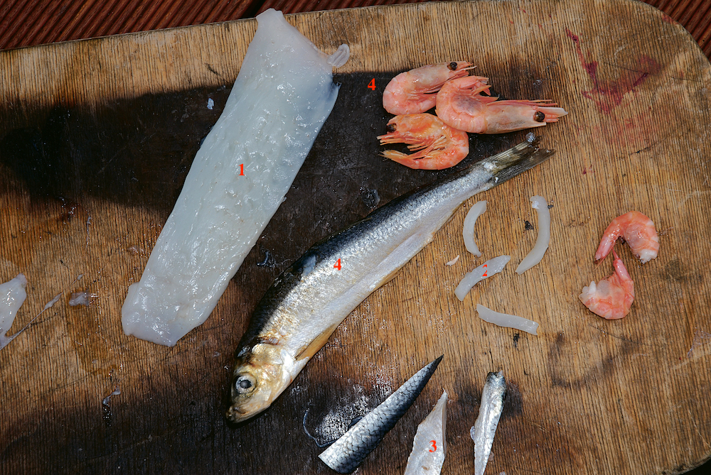 Auswahl an Naturködern: 1. Heringsfetzen (als Filet) oder 2. und 3. als Fetzen, 4. Sprotte, 5. Garnelen