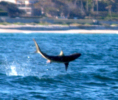 Einen Tarpon und einen Thun kreuzen, den Nachkömmling mit Anabolika voll pumpen und braun anmalen, das Ergebnis wäre ein Spinner Shark! Und diesen Fisch kann man sogar mit der Fliegenrutel fangen!