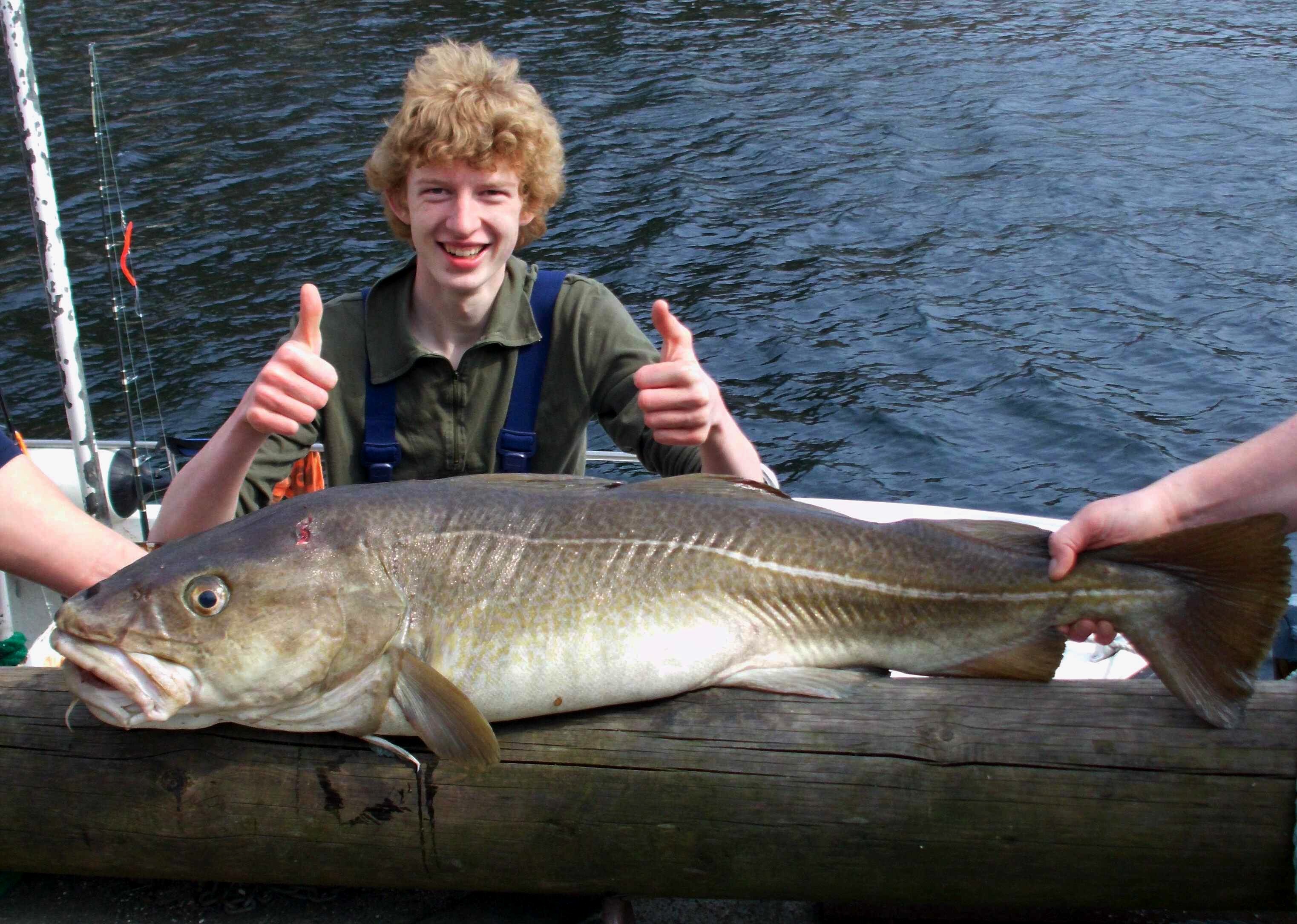 Auf unserer Angeltour im April 2011 nach Südnorwegen ist meinem 15-jährigen Sohn Hendrik ein sehr schöner Fang gelungen. Auf einem Plateau vor dem Rekefjord fing er in einer Tiefe von 80 m einen 17,5 kg (35 Pfund) schweren Dorsch! Der 116 cm lange Dorsch biss auf einen roten Norwegen-Makks, der auf einem Vorfach vor einem 400 g schweren Norway Pilker montiert war. Mit seiner 20lbs Seahawk Pilkrute und einer 760 Penn Live Liner, bespult mit einer 22 mm geflochten Schnur, brachte Hendrik den Fisch nach 15 Minuten ins Boot.
