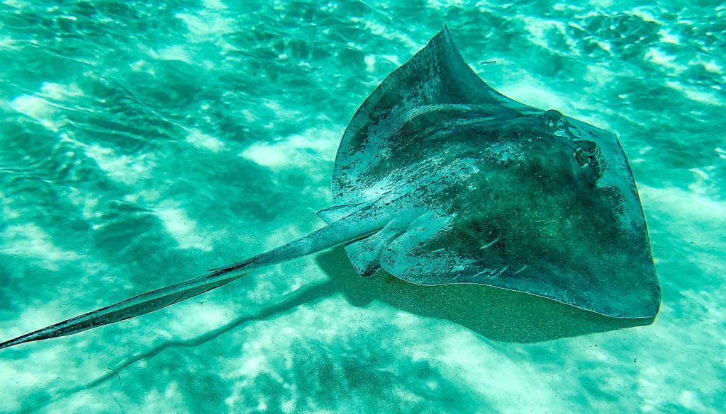 Etwa in der Mitte des Schwanzes haben Stechrochen einen Giftstachel mit Widerhaken, der böse Verletzungen hervorrufen kann und bei großen Exemplaren das Format eines Küchenmesser erreicht.