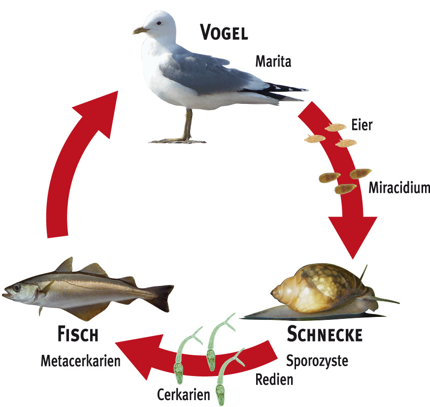 Mitunter weisen Dorsche, Wittlinge oder Pollacks, die aus küstennahen Gewässern stammen, eine mehr oder weniger große Anzahl kleiner, schwarzer Flecken auf. Hierbei handelt es sich keinesfalls um eine Pigmentanomalie, wie ich schon von Anglern gehört habe, sondern um Fischparasiten, nämlich einen Cercarienbefall. Cercarien sind Trematodenlarven (Wurmlarven), die Teil eines relativ komplizierten Entwicklungszyklus’ sind, bei dem auch Möwen und Strandschnecken eine Rolle spielen. Werden die Fische gegart, können sie bedenkenlos verzehrt werden.
