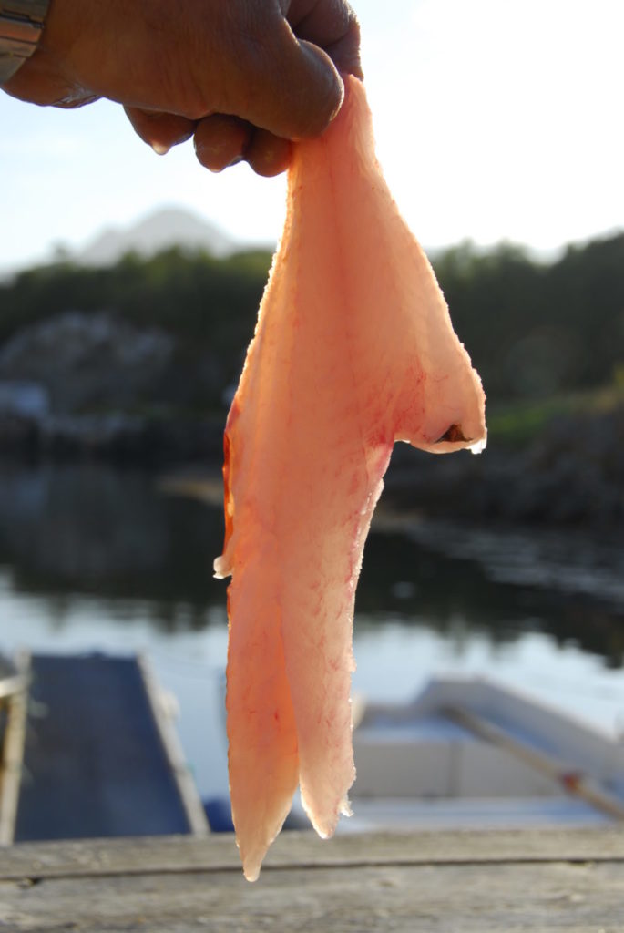 Die enthäuteten Filets gegen das Licht (zum Beispiel Sonne oder Neonröhre) halten, hilft, Würmer zu entdecken. Dieses Rotbarschfilet ist offensichtlich wurmfrei.