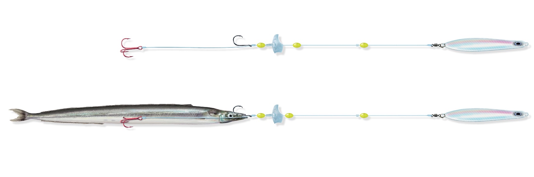 Die „Action-Disc“ verleiht dem Köder noch mehr Aktion, ähnlich wie das Cup-Rig beim Raubfischangeln. Das Vorfach ist 1,20–1,50 m lang. Der Autor verwendet für den vorderen Haken einen Circle Hook der Größe 4 und für den hinteren Haken einen Drilling derselben Größe. Das Ganze wird je nach Strömung hinter einem Buttlöffel oder Mefo-Blinker von 30-60g geführt.