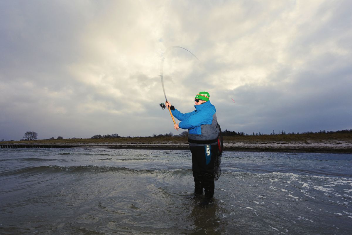 Richtig durchziehen: Mit kraftvollen Würfen bringt Mathias Brauch seine Köder auf enorme Weiten. Die 2,40 m lange Rute hat ein Wurfgewicht von 40 g.