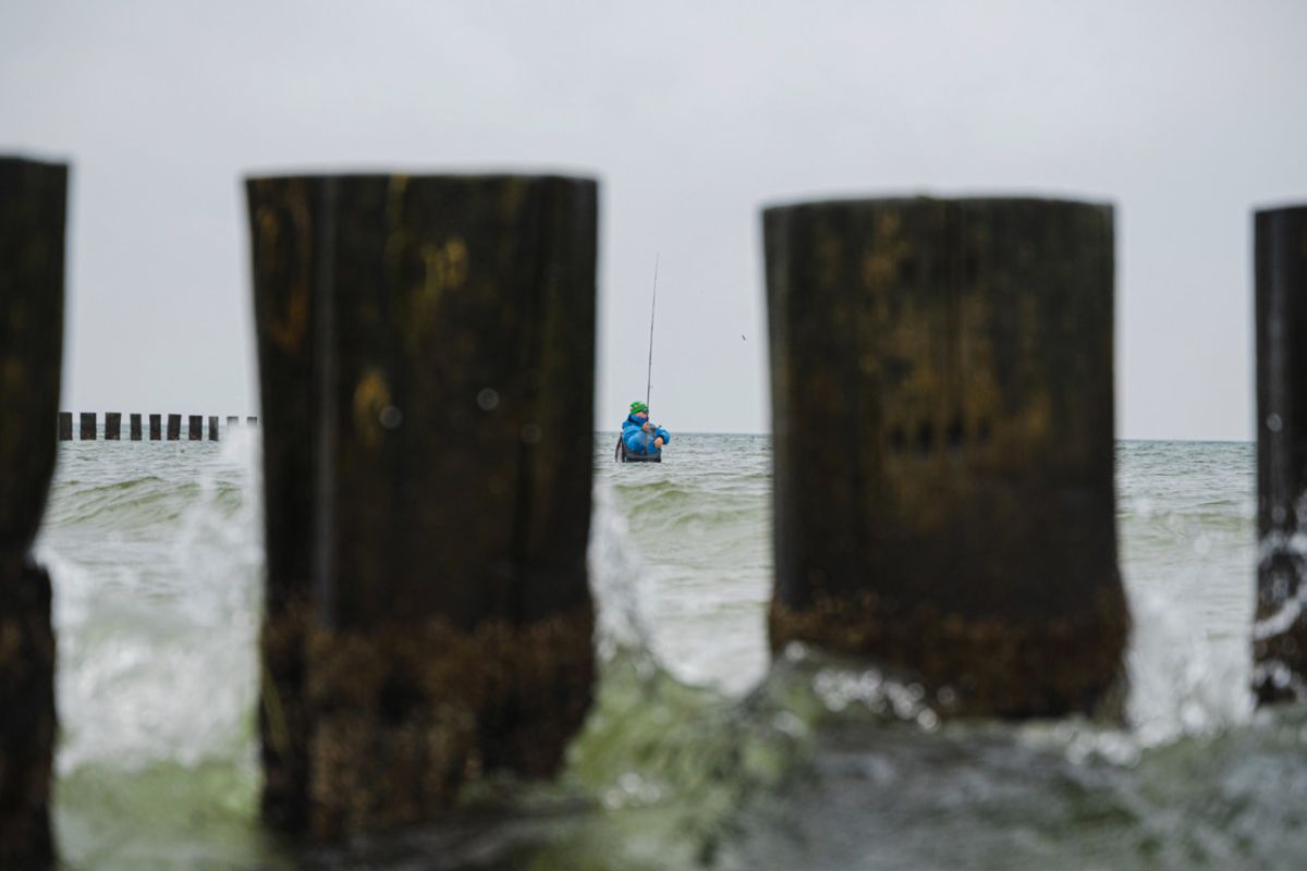 Habe ich einen langen Bereich mit vielen Buhnenfeldern vor mir, bekommt jede Buhne von mir etwa zehn Würfe. Den ersten Wurf mache ich dabei schon aus der Nachbarbuhne parallel zum Strand in der ersten Rinne. Diese ist meist hüfttief und nicht selten voller Steine. Stehe ich in der Nachbarbuhne, bekommt mich eine Forelle in dieser Rinne gar nicht mit und sieht meinen Köder, bevor ich sie verscheuche. Würde ich dagegen einfach in der Buhne ins Wasser reinlaufen, wären die Forellen schon längst weggeschwommen. Danach fische ich die Buhne von einer Seite zur anderen schnell aus.