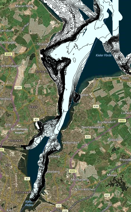 Hier eine Beispielkarte der Kieler Förde. Die Daten werden unter www.insightgenesischallenge.com hochgeladen. Der Nutzer, der unter „Public“ im Monat flächenmäßig am meisten hochgeladen hat, gewinnt.