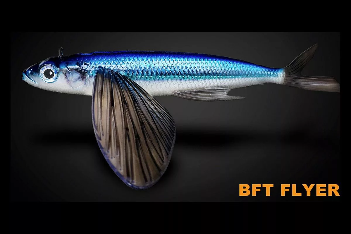 Seine Spannweite beträgt 30 cm, ebenso wie die Körperlänge. Und das PVA-Material, aus dem der Köder gefertigt ist, soll selbst die härtesten Bisse überstehen. Den fliegenden Fisch kann man entweder schleppen oder an einem Drachen anbieten. Zielfische sind des BFT Flyer sind laut Aussage des Herstellers Thunfische und Schwertfische, er kommt damit beim Big Game-Angeln zum Einsatz.