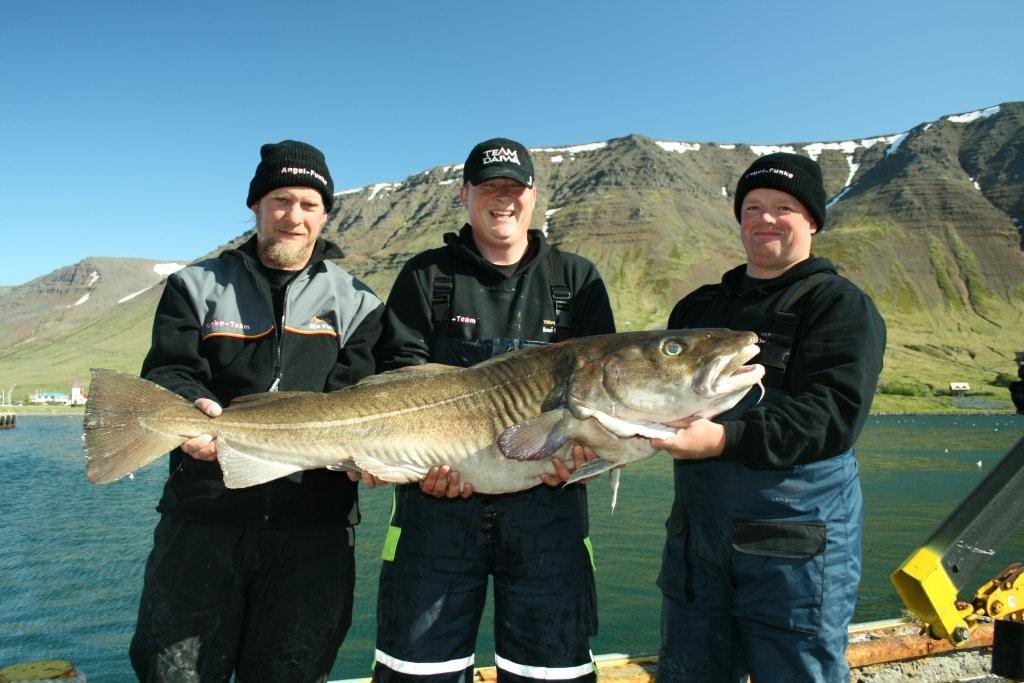 Die logische Konsequenz hing um 9.30 Uhr beim offiziellen Morgentermin am Haken der Digital-Waage. René Krüger konnte einen gewaltigen Dorsch von nahezu unglaublichen 49 Pfund 300 Gramm landen. Was für ein Fisch! Die magische 50-Pfund-Marke ist damit nur um Haaresbreite verfehlt worden. Die Durchschnittsgewichte steigen ebenfalls. Das „Boot der Meister“, mit den Welt- und Europameistern Uwe Dittmann, Horst Hennings sowie dem Vorjahressieger André Rossat an Bord, konnte 10 Dorsche anlanden, die allesamt etwa um die 25 Pfund Stückgewichte hatten. Die intensiven Vorbereitungen vieler Festivalteilnehmer scheinen sich auszuzahlen. Lediglich ein Heilbutt fehlt noch in der Fangstatistik, aber die Teams arbeiten daran… Bei der Köderwahl sind diverse Neuerungen zu beobachten: Neben den klassischen Pilkern sind zum Teil selbst angefertigte Gummifische im XXL-Format in diesem Jahr die absoluten Top-Köder. Live für den Blinker aus den Westfjorden: Lars Berding -Angelreisen Hamburg-