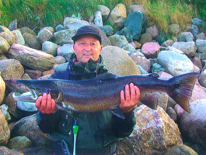 Als Wolfgang Kasper seinen Sohn zum Angeln abholte, sagte er ihm noch, dass er heute einen schönen Fisch aus dem Wasser ziehen werde. Gesagt, getan: An der Flensburger Förde angekommen, montierten die Petrijünger ihre Ausrüstung und stiegen ins Wasser. Die Sonne schien, aber auch ein paar Regenschauer gingen nieder, der Wind kam aus West in den Stärken 3 bis 4. Das 15 Grad warme Wasser war leicht wellig. „Es war gegen 16.30 Uhr, es war mein achter Wurf mit der leichten Spinnrute, als ich zu meinem Sohn sagte, ich glaube, da ist ein Dorsch eingestiegen“, sagt Wolfgang Kasper. Der Fisch ließ sich nämlich wie ein schwerer, nasser Sack heran kurbeln. „Doch etwa fünf Meter vor mir explodierte der vermeintliche Dorsch. Es gab einen gewaltigen Wasserschwall und der Fisch zog in kürzester Zeit etwa 100 Meter Schnur bei kreischender Bremse von der Rolle“, beschreibt der Angler die aufregenden Momente. Noch wusste er nicht, was gebissen hatte, doch ihm war klar: „Das muss ein ganz Großer sein“. Der Fisch zeigte sich das erste Mal bei einem gewaltigen Sprung aus dem Wasser. Jetzt konnte Wolfgang Kaiser erkennen, dass es sich um einen gewaltigen Salmoniden handelte. Der Fisch war ein echtes Kraftpaket und entwickelte enormen Druck, so dass sich die leichte Rute wie ein Flitzbogen krümmte. „Ich habe innerlich gebetet, dass der Fisch nicht aussteigt, dass der Haken gut sitzt und meine Bremse richtig eingestellt ist“, berichtet der Angler. Das Material hielt dem Druck stand. Nach etwa 20 Minuten war es soweit. Wolfgang Kaiser zog einen 90 Zentimeter langen und 15 Pfund schweren Lachs über seinen Kescher. „Wahnsinn! Wir mussten uns erstmal wieder beruhigen. Aber jetzt musste alles schnell gehen, da es sich um einen gefärbten Lachs handelte, der schonend wieder ins Wasser zurückgesetzt werden sollte“, sagt der glückliche Fänger. Nach ein paar Fotos und dem Vermessen schwamm der Fisch wieder in seinem Element. Anschließend gönnten sich die beiden Angler erst einmal Nervennahrung in Form eines Biers. Den „Plop“ des Flaschenöffnens hat man wohl bis Dänemark gehört.