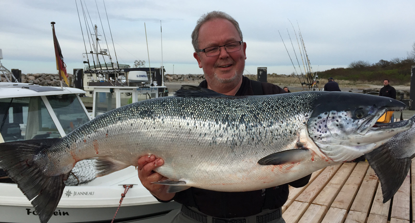 In seiner sicher 25jährigen Laufbahn als Trollingangler hat Hans-Heinrich Müller von der Ohe nichts Vergleichbares erlebt, wie am 19.4.2015 vor Nordostküste Rügens: Zunächst habe ich erfolglos an der Ansteuerungstonne Arkona gefischt, erinnert sich Müller von der Ohe. Dort erhielt ich dann jedoch von Freunden die Nachricht, dass es im Osten besser gehen würde. Da habe ich meine ganze Ausrüstung eingeholt und bin quer über die Bucht zum vermeintlichen Hotspot gefahren. Um 11:20 hatte ich dort die Köder wieder im Wasser. Der erste brutale Biss erfolgte ca. um 12:30. Ein alter, völlig abgenudelter Big Ed-Blinker in einer Rügen-Spezialfarbe hinter einem 20-Gramm-Blei und einem Sideplaner-Board war attackiert worden. Jetzt musste ich 25 Minuten auf Biegen und Brechen drillen, bis mein Freund Kurt Tomasiewicz aus Wien den riesigen Salm keschern konnte. Bei 1,21 m Länge brachte er 21 kg auf die Waage, ein Kilogramm mehr als mein bisher schwerster, der allerdings mit 1,27 sogar noch etwas länger gewesen war.
