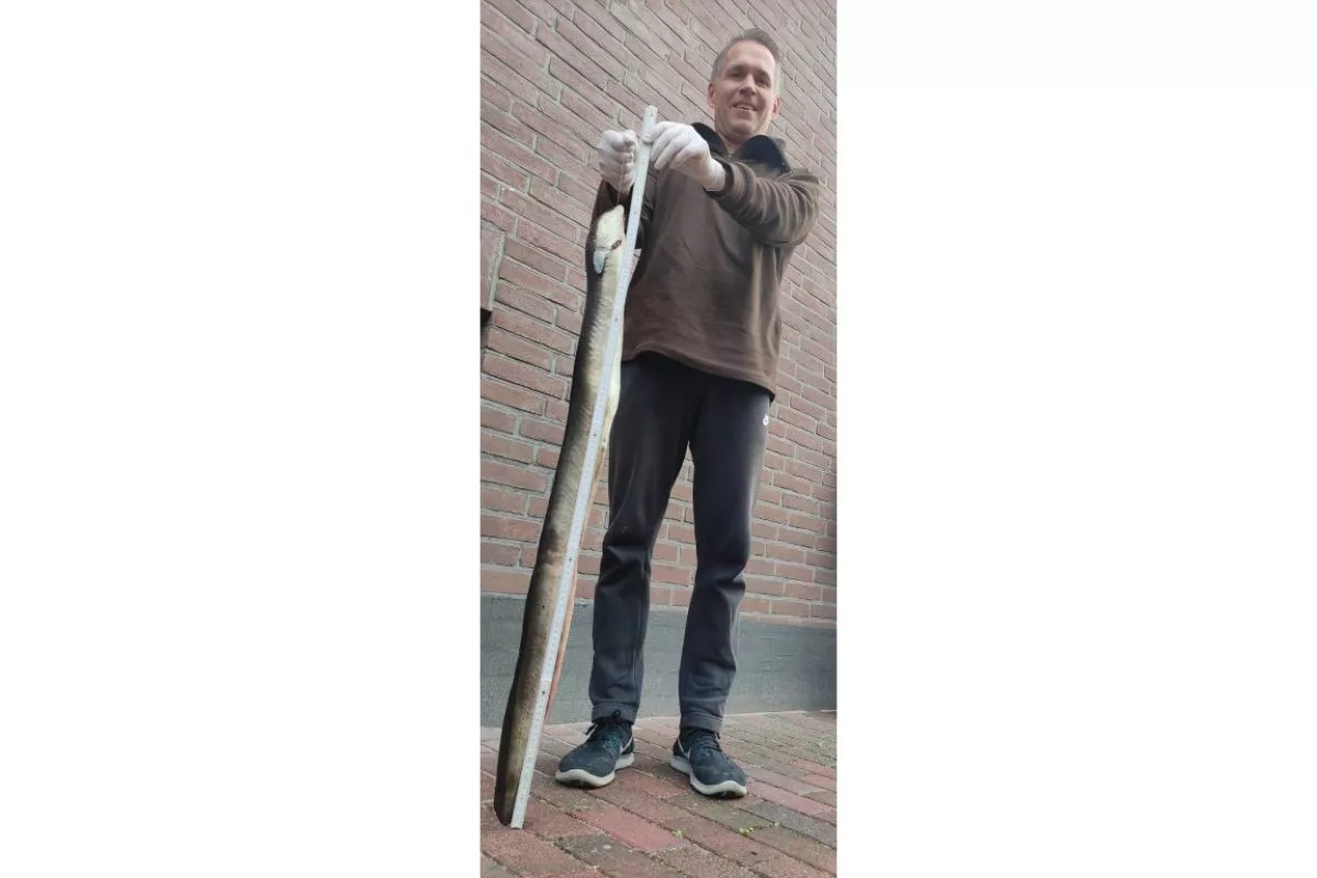 „ Dieses Mal kam der Aal auf mich zugeschwommen, war aber schon gehakt. So konnte er nach kurzem Drill sicher gekeschert werden. Zur Landung der großen Aale verwendet Holger einen Meerforellenkescher mit kurzem Griff. Nur mit diesem lassen sich die Aale vom Schwanz her keschern. Beim diesjährigen Großaal zeigte die Waage ein Gewicht von 5 Pfund 140g an.