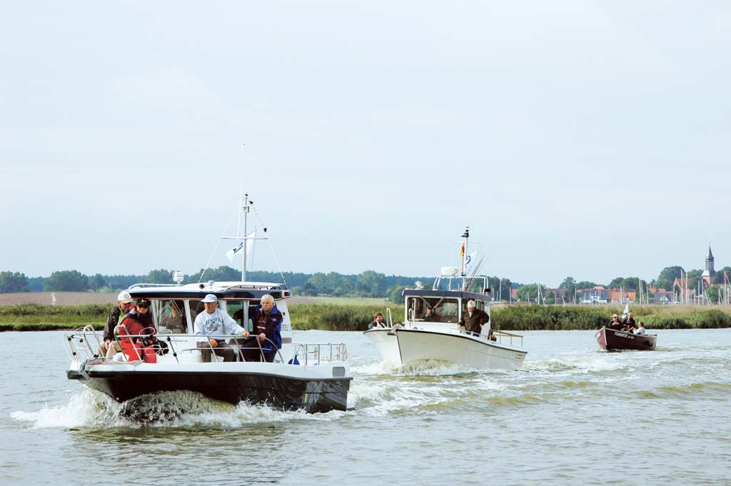 Schwärme von Seeschwalben und Möwen über dem Wasser verraten uns, wo unter Wasser die Fischschwärme im Peenestrom sind. Immer wieder stürzen die Vögel in kleinen Gruppen auf die Oberfläche und schnappen sich kleine Stinte. Stundenlang beobachten wir dieses Schauspiel und beteiligen uns selber auch an der Jagd. Aber wir haben es auf die abgesehen, die von unten auf die Stinte zustoßen. Um unser Boot herum leben Unmengen von Barschen hemmungslos ihren Fressrausch aus. Sie attackieren alles, was wir ihnen vorsetzen. Das Heringspaternoster ist kaum am Boden angekommen, da sind auch schon alle Anbissstellen besetzt, allerdings mit eher etwas kleineren Exemplaren. Mehr Spaß macht das Fangen mit einem Einzelköder, dessen Größe auch die Durchschnittsgröße der Barsche erhöht.