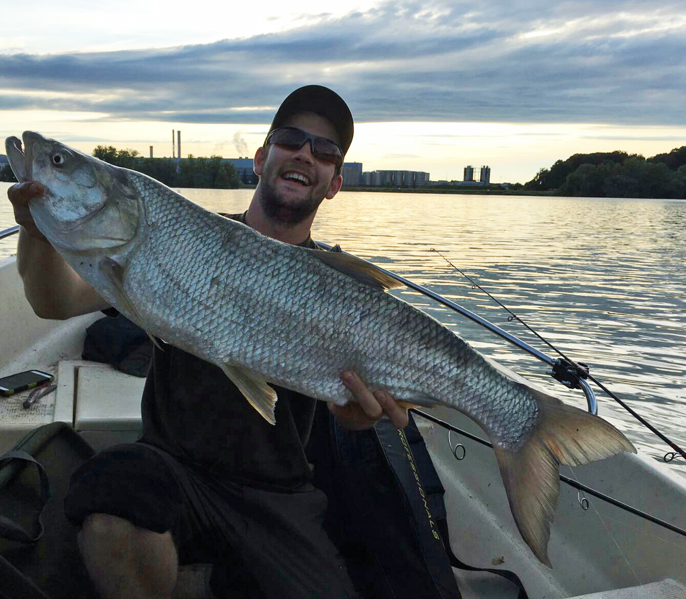 Am Rhein bei Wörth war Dominik Meyer mit einem Großrapfen erfolgreich. Dominik päsentierte seinen blaugrauen Twister in einem Rheinhafen, weil im Fluss starkes Hochwasser herrschte. Kaum klatschte der Köder zwischen zwei im Wasser stehenden Bäumen auf, erfolgte ein hammerharter Biss. Ein großer Rapfen hatte den Twister genommen und versuchte immer wieder den Haken abzuschütteln. Nach einem brachialen Drill konnte Dominik dann einen Rapfen von 85 Zentimeter Länge ins Boot holen. Gewicht des Ausnahmefisches: 13 Pfund 425 Gramm.