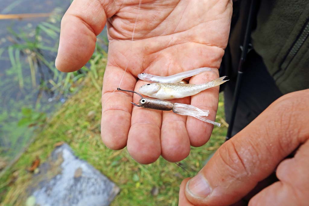 Was sieht einem kleinen Stint so ähnlich, dass die Barsche den Kunstköder nicht von einem echten Fisch unterscheiden können? Kleine Tubes und Fischchen-Nachahmungen! Am liebsten fische ich diese Köder an der selbst gebauten Hegene, indem ich zwei Haken in Dropshot-Manier an ein ca. 1,20 Meter langes Stück Fluorocarbon knüpfe. Die Kunstfischchen werden einfach durch den Kopf gehakt. Aufgrund ihrer Fransenschwänze, die im Wasser schön spielen, fangen Mini-Tubes extrem gut. In Gewässern, in denen mehrere Anbiss-Stellen erlaubt sind, befestige ich als Beschwerung oft noch einen kleinen Zocker. Dieses Set-Up täuscht den Barschen eine Beutejagd vor. Ein kleiner Fisch versucht zwei Stinte zu fressen. Und das lassen sich Barsche als Futterneider nicht so einfach bieten. In der Regel hängen daher auch die größeren Barsche am Zocker. Außerdem lassen sich so, verschiedene Tiefen abfischen.