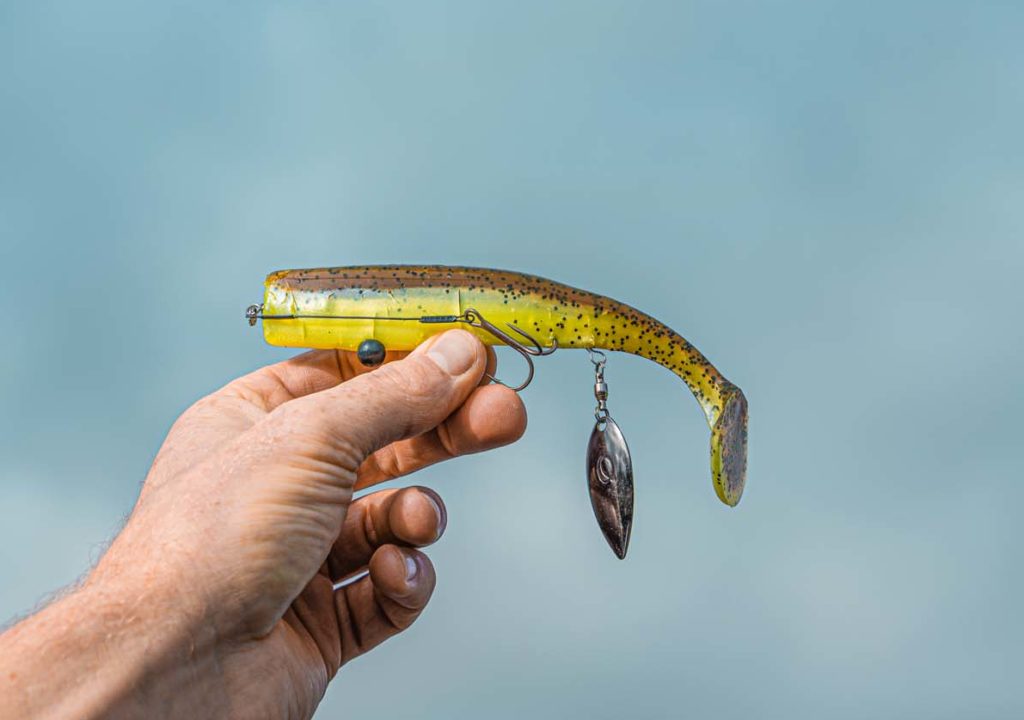 Der riesige Tellerschwanz lässt es erahnen: Dieser Köder rastet unter Wasser aus. Denn er flankt sehr stark und macht eine ordentliche Druckwelle. In Kombination mit einer kontrastreichen Farbe (dunkler Rücken, heller Bauch) geht er den zahnträchtigen Fischen im Kraut ordentlich auf die Nerven. Den Reiz verstärke ich gern noch durch ein Spinnerblatt an einer Schraube, die ich einfach in den Tellerschwanz drehe. Reizüberflutung!