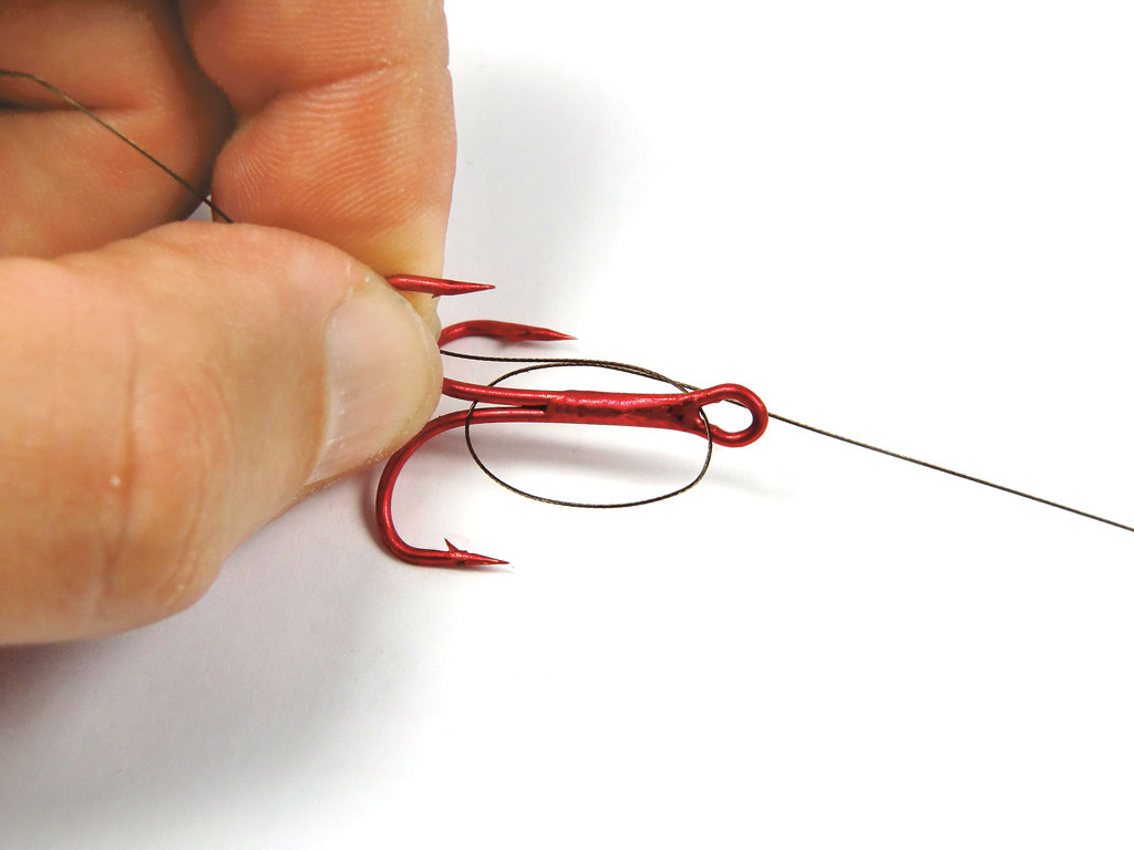 8. Jetzt wickelt man das Stahlvorfach 8 bis 10 Mal um den Schenkel des Drillings und führt es durch das Öhr.