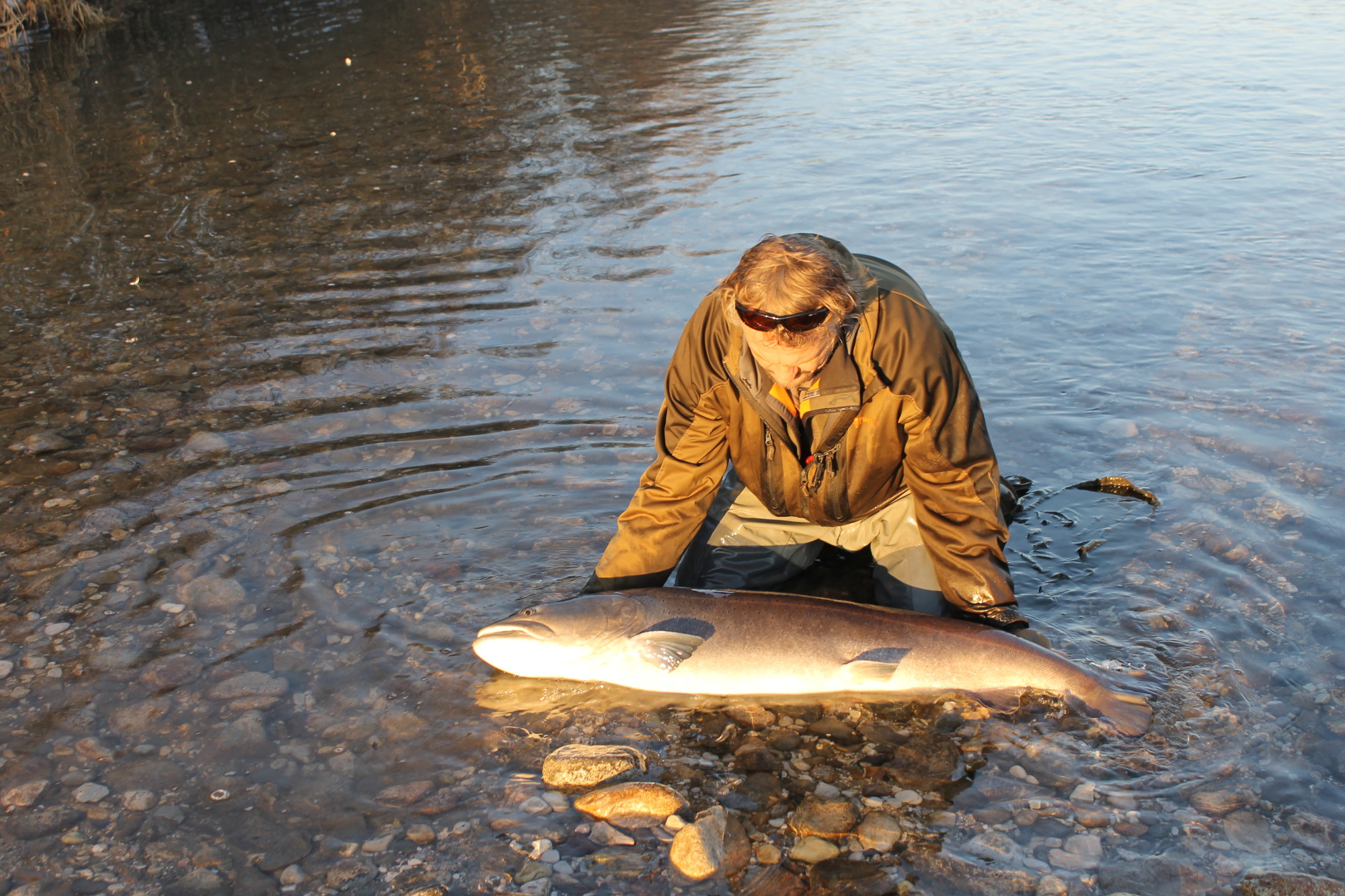 Werner knallte die Rollenbremse zu, um den stärksten Druck auf den Fisch ausüben zu können. Das machte Eindruck auf den nun merklich ermüdeten Fisch. Die Strömung kam Werner zur Hilfe und trieb den gewaltigen Fisch in seine Richtung.Werner warf die Rute aus der Hand und sich selbst auf den Fisch. Auf diese Weise konnte er einen Traumhuchen von 48 Pfund landen. Werner war glücklich, obwohl seine Wathose voll Wasser war und er während der beiden Flussquerungen fast einen Watschuh verloren hätte.