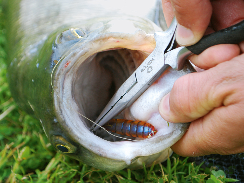 Wir beide hatten keine Ahnung, was da den Ecogear eingeschlürft hatte. Nach einigen Minuten Drill konnte der Kescher einen Rapfen von knapp 80 Zentimeter umschließen. Der Köder war komplett eingeschlürft worden und es erschien fast wie ein Wunder, dass die kleinen Drillinge den Drill unbeschadet überstanden hatten.