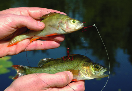 Der obere Köderfisch ist im Maul durch beide Lippen gehakt (für schnellere Fahrt), der untere im Rücken (für langsame Führung). Heinz Jagusch