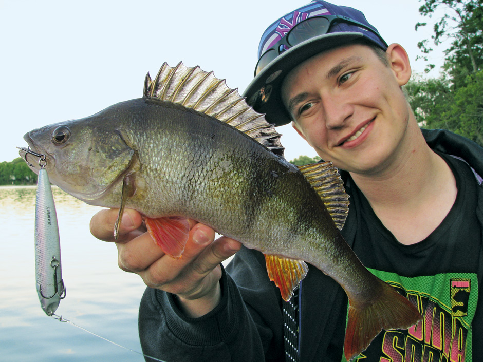 Als der Köder dann endlich das Wasser erreichte, kurbelte ich den Sammy einfach ein, so wie ich es von Blinker und Spinner kannte. Es sah nach nichts aus. Da ich irgendwo gelesen hatte, dass er durch Zupfer aus der Rutenspitze zum Wackeln animiert wird, versuchte ich es daher auf diese Weise. Zunächst erfolglos. Ständig verfing sich der obere Drilling des Sammys im Vorfach. Es war zum Verzweifeln! So viel Geld für diesen Köder ausgegeben, und dann funktioniert er nicht! Nach unzähligen Minuten der Verzweiflung hatte ich verstanden, dass die Schläge mit der Rute nicht so hart ausfallen dürfen. Dann überschlägt er sich nicht und läuft ideal. Doch sollten Rapfen wirklich auf so einen komisch wackelnden Köder hereinfallen? Da ich mich so darüber freute, dass ich es geschafft hatte den Sammy zum Wedeln zu animieren, angelte ich länger mit ihm, als geplant war. Doch auf einmal spritzte das Wasser auseinander, direkt an meinem Köder. Ich hatte mich so erschrocken, dass ich im selben Moment den Anhieb setzte und der Sammy an mir vorbei gerauscht kam! Um das, was danach passierte, ein wenig abzukürzen: Ich fing an diesem Tag mit dem Sammy drei Barsche bis 40 Zentimeter!Reflex ausschalten